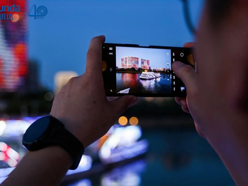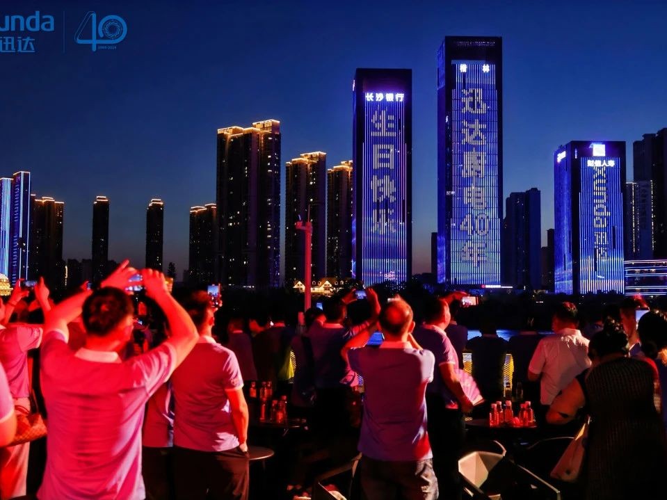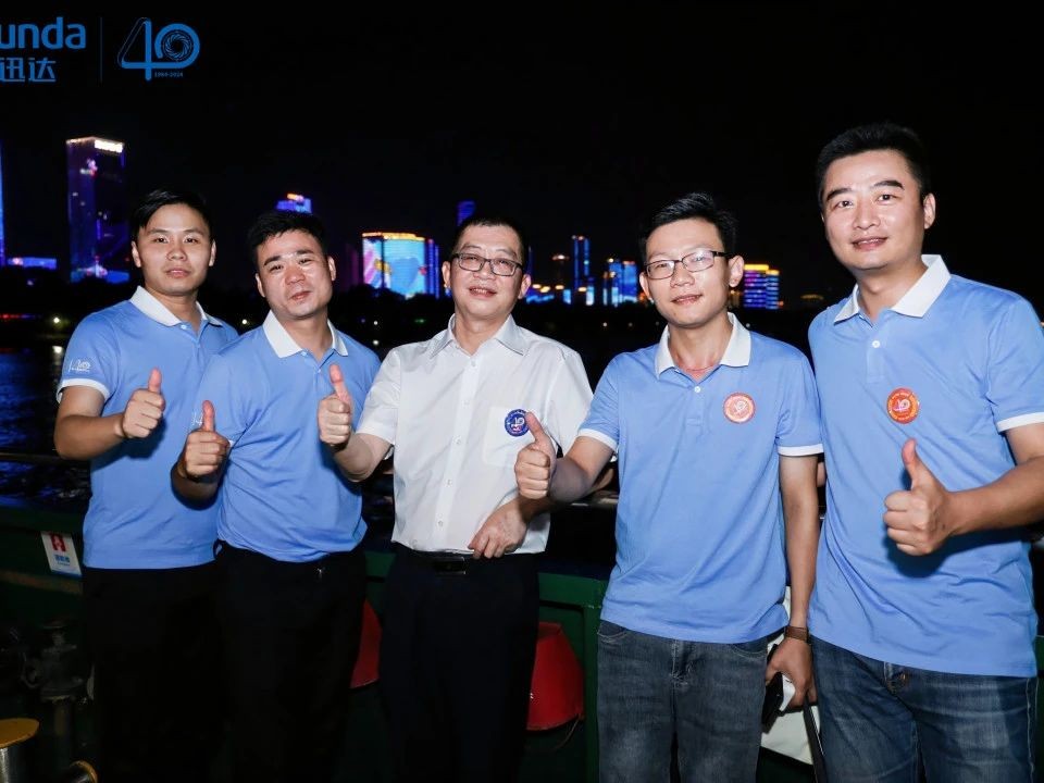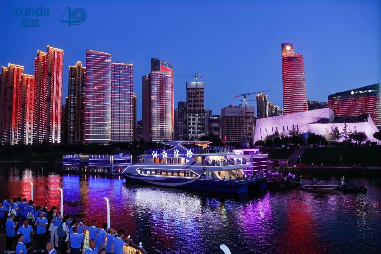 游輪行至橘洲水域,兩畔“四十風華,迅達正燃”系列主題燈光秀耀目啟動,賓客們置身于湘江流動畫卷之中,感受如夢似幻的兩岸燈光,在波光倒影與璀璨夜色的交相輝映下。大家紛紛合影留念,記錄下這“歷史性”的難忘時刻,共賀迅達40周年生日快樂。